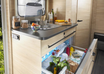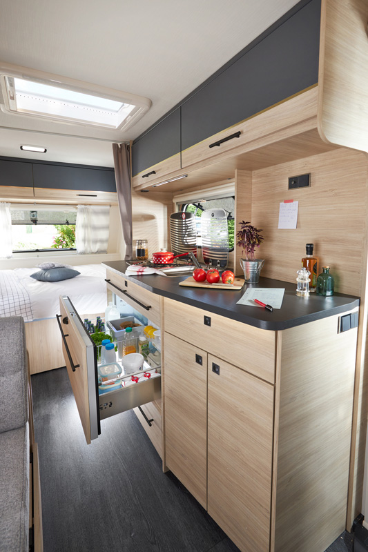 Vous aimerez vivre, cuisiner et circuler dans cette caravane parfaitement agencée. L’espace cuisine offre un plan de travail de 120 cm