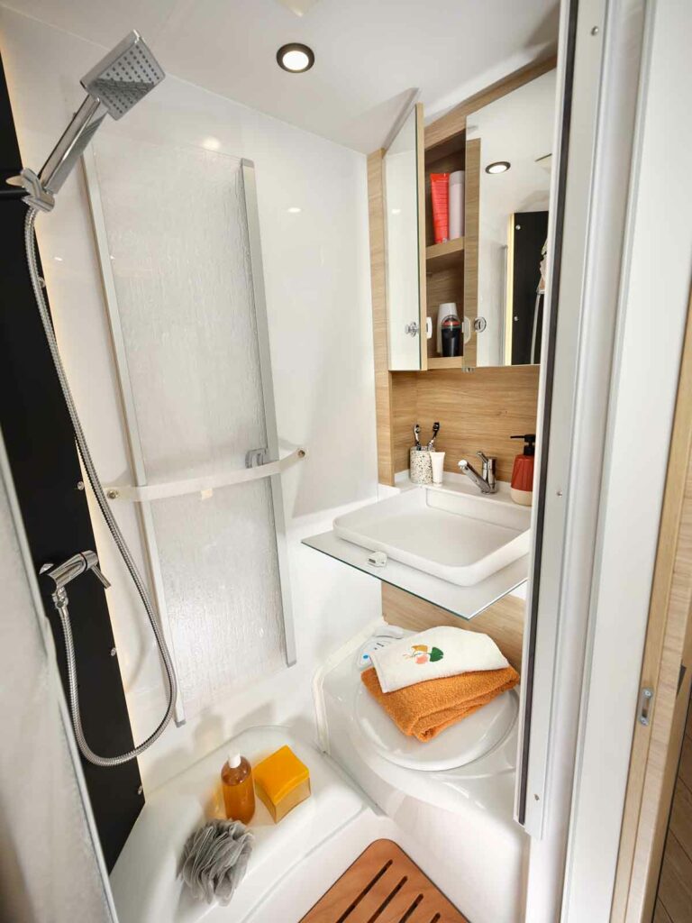 Avec ses deux lits superposés à l’arrière, un grand lit fixe à l’avant et une dînette transformable, la 496PE offre une belle capacité d’accueil sans sacrifier le confort. Aucun couchage face à face, une circulation fluide, une salle d’eau bien équipée, un matelas 15 cm et un frigo XL : tout est réuni pour voyager en famille dans une ambiance claire, pratique et bien structurée.